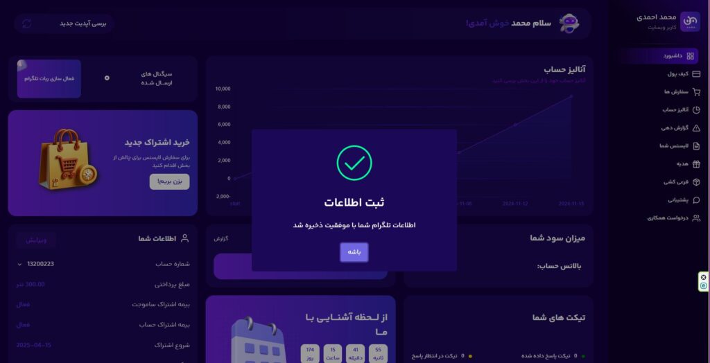 بعد از تایید بصورت اتومات به داشبورد برمیگردید و به شما تاییدیه ثبت اطلاعات داده میشود